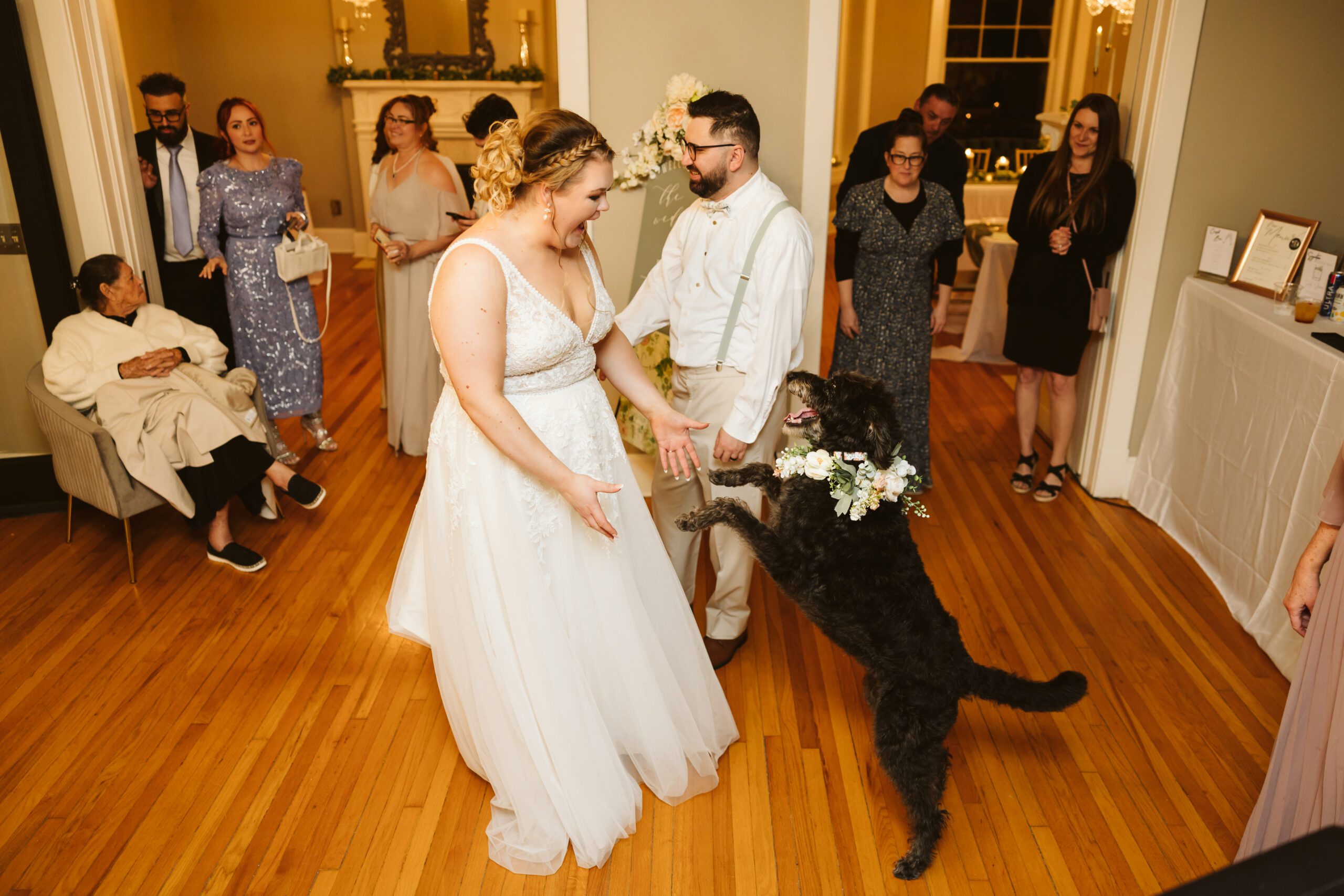 We embraced the brisk air for some quick portraits and then headed for the warmth of the gorgeous historic estate where their guests were waiting to spend some time celebrating the newlyweds. Heartfelt speeches were made, and the cake was cut before everyone headed to the dance floor. Anna’s sister serenaded everyone as Anna & Weimer shared their first dance. The rest of the evening was all about the music, the laughter, and a dance floor alive with the harmony of two families becoming one. (Even their furbabies joined in.) And as the evening drew to a close, sparklers lit up the night, sending Anna and Weimer off into their new life together with a glow as warm as the day had been.